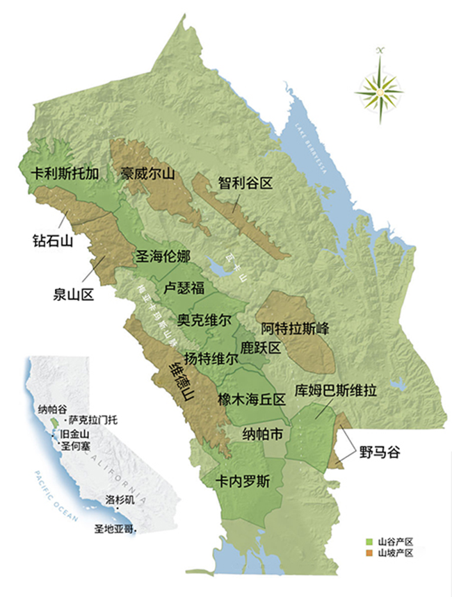 納帕谷坐落在圣帕布魯灣的北側(cè)以及舊金山灣(San Francisco Bay)地區(qū)的東北角,其東側(cè)是瓦卡山(Vaca),跨過這座山便可到達中央山谷(Central Valley)的北部,西側(cè)是梅亞卡瑪斯山(Mayacamas),也是納帕谷與索諾瑪縣(Sonoma County)的分界線。納帕谷南北長約50公里,東西跨度僅有幾公里,雖然面積不大,但這里是美國第一個農(nóng)業(yè)保護區(qū)(Agricultural Preserve),也是加利福尼亞州的第一個法定種植區(qū)(American Viticultural Area,簡稱AVA)。根據(jù)不同的土壤、氣候和地形,產(chǎn)區(qū)內(nèi)又細分為十六個法定種植區(qū)。