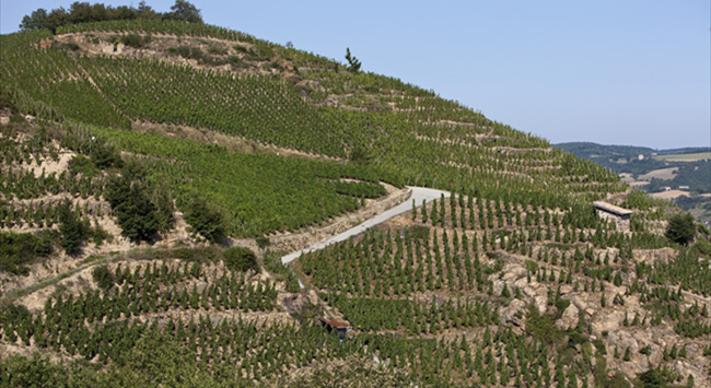 在北羅納河谷葡萄園,河流流經(jīng)之處多為狹窄的峽谷和陡峭的山坡,因此葡萄園也更多地種植在靠近河流的陡坡上。由于離海洋較遠(yuǎn),北羅納河谷葡萄園以大陸性氣候?yàn)橹?,但又多多少少?huì)受到地中海(Mediterranean)氣候的影響,夏季炎熱干燥,冬季寒冷少雨。這里的土壤以礫石、頁(yè)巖和石灰?guī)r為主,排水性能優(yōu)越。這樣一來,種植在山坡上的葡萄藤可以更好地接收生長(zhǎng)季充足的陽(yáng)光,再加上排水性良好的土壤,有助于葡萄果實(shí)更好地成熟。北羅納河谷葡萄園著名的子產(chǎn)區(qū)羅第丘(Cote Rotie)的產(chǎn)區(qū)名在法語(yǔ)中意為“被炙烤的山坡”,就很形象地描繪了這一風(fēng)土特點(diǎn)。