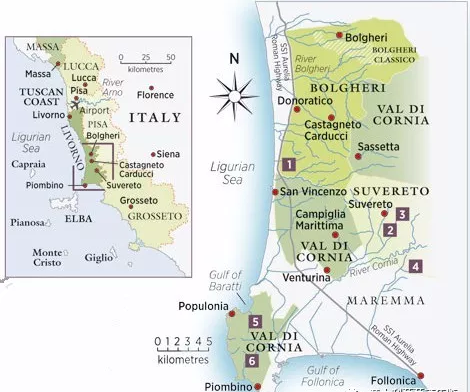 Bolgheri位于托斯卡納海岸Livorno省的Castagneto Carducci區(qū),北臨Pisa市,南接Maremma地區(qū),周邊環(huán)繞有Cecina河和Cornia河,葡萄園地勢平緩,總面積達1200公頃,氣候為溫和的地中海氣候。