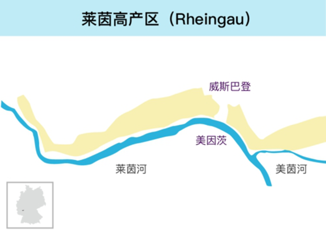 萊茵高是德國(guó)最小但最重要的葡萄酒產(chǎn)區(qū)之一,也是世界上知名的優(yōu)秀葡萄酒產(chǎn)區(qū)。萊茵高位于威斯巴登( Wiesbaden)和勞赫豪森(Lorchhausen)之間,整個(gè)產(chǎn)區(qū)沿萊茵河分布,由西而東地形從寬闊的平原逐漸變?yōu)槎盖偷男逼?,景色十分?yōu)美。