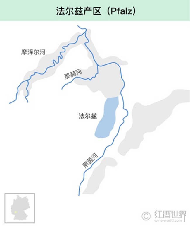 法爾茲產(chǎn)區(qū)北接萊茵黑森(Rheinhessen),南部、西部則與法國(guó)接壤,其葡萄園南北綿延達(dá)80公里。從面積上來(lái)說(shuō),法爾茲是德國(guó)第二大產(chǎn)區(qū),但其產(chǎn)量時(shí)常能夠占據(jù)13產(chǎn)區(qū)之首。產(chǎn)區(qū)名字“Pfalz”來(lái)源于拉丁語(yǔ)“palatium”,意為“宮殿”。