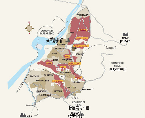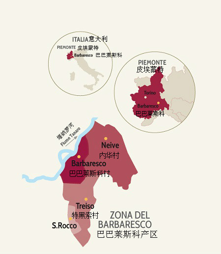 巴巴萊斯科的葡萄園面積僅為巴羅洛的1/3,主要分布在巴巴萊斯科村、內(nèi)華村(Neive)和特黑索村(Treiso)三大著名村莊內(nèi)。因地理位置不同,這些村莊的風(fēng)土條件略有差異:巴巴萊斯科村緊鄰塔納羅河,氣候比較溫和;內(nèi)華村土壤類(lèi)型多樣,除了鄰近巴巴萊斯科村的葡萄園之外,這里大部分葡萄園的土壤富含沙石;而特黑索村在高海拔和森林的調(diào)節(jié)下,氣候最為涼爽。