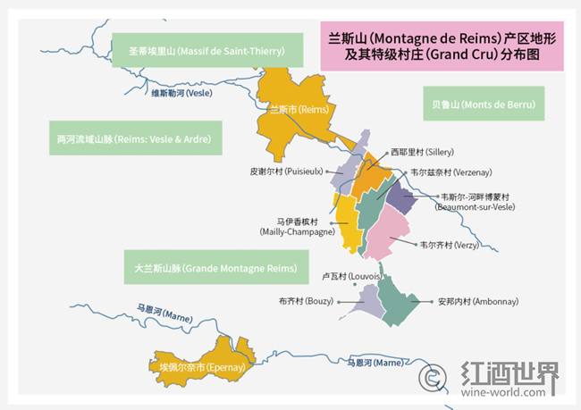 在香檳產(chǎn)區(qū)的17座特級(jí)村莊(Grand Cru)中,蘭斯山地區(qū)共有9座被列入其中。大規(guī)模香檳酒莊所使用的優(yōu)質(zhì)釀酒葡萄多來(lái)自于此,這些特級(jí)村莊的葡萄果實(shí)達(dá)到了完美的成熟度,且100%符合香檳產(chǎn)區(qū)的嚴(yán)格要求。不僅如此,這9座特級(jí)村莊全部來(lái)自大蘭斯山脈地區(qū),該地區(qū)是蘭斯山產(chǎn)區(qū)內(nèi)最大的葡萄種植區(qū)域,面積約達(dá)4,037公頃,同樣以種植黑皮諾為主。