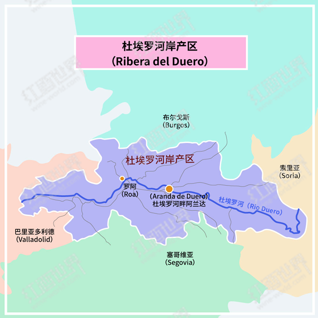 杜埃羅河岸位于伊比利亞半島(Iberian Peninsula)北部的高地,是卡斯蒂利亞-萊昂自治區(qū)(Castilla y Leon)的著名子產(chǎn)區(qū)。該產(chǎn)區(qū)沿杜埃羅河(Rio Duero)及其支流分布,在行政區(qū)劃上涉及索里亞(Soria)、布爾戈斯(Burgos)、巴利亞多利德(Valladolid)和塞哥維亞(Segovia)這四個省。產(chǎn)區(qū)葡萄園占地約22,500公頃,多分布于海拔760至945米的高地,且集中在河岸朝北或朝南的山坡上。