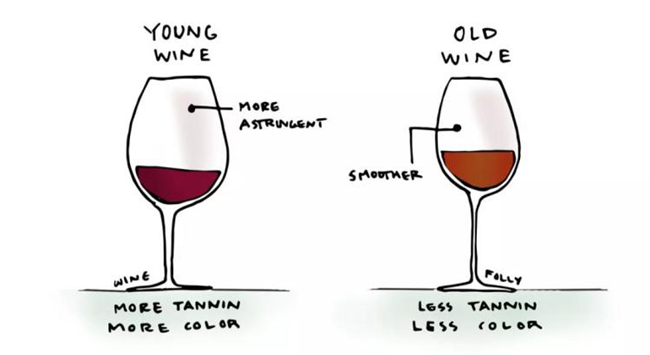 隨著葡萄酒的老化,顏色變得不那么強(qiáng)烈,非常古老的葡萄酒顏色蒼白,半透明。