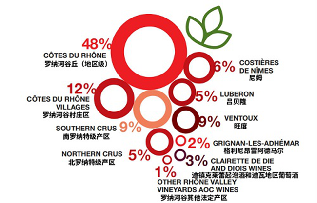 羅納河谷丘是羅納河谷葡萄園的明星產(chǎn)區(qū)。在這里,各個子產(chǎn)區(qū)從低到高依次被劃分為三個等級——羅納河谷丘(Cotes du Rhone AOC)、羅納河谷村莊區(qū)(Cotes du Rhone Villages AOC,有譯為“羅納河谷丘村莊級”)以及羅納河谷區(qū)特級產(chǎn)區(qū)(Cotes du Rhone Crus AOC,有譯為“羅納河谷丘特級村”;南、北羅納河谷葡萄園分別有9個和8個特級產(chǎn)區(qū),共計17個特級產(chǎn)區(qū))。2019年,羅納河谷丘(地區(qū)級)的產(chǎn)量為1.33億升,占整個羅納河谷葡萄酒產(chǎn)量的48%;羅納河谷村莊區(qū)的產(chǎn)量為0.34億升,占總產(chǎn)量的12%;羅納河谷區(qū)特級產(chǎn)區(qū)的產(chǎn)量為0.38億升,占總產(chǎn)量的14%。合計起來,羅納河谷丘對羅納河谷葡萄酒總產(chǎn)量的貢獻率達74%,地位舉足輕重。
