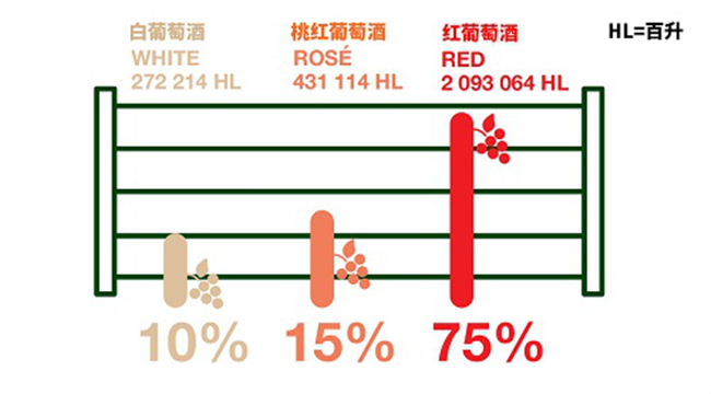 2019年,在羅納河谷葡萄酒約2.8億升的總產(chǎn)量中,紅葡萄酒貢獻了近2.09億升,占總產(chǎn)量的75%;桃紅葡萄酒的產(chǎn)量約為0.43億升,占總產(chǎn)量的15%;白葡萄酒的產(chǎn)量約為0.27億升,占總產(chǎn)量的10%。