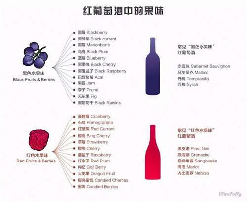 ?、偌t葡萄酒中的果味有兩類,紅色水果和黑色水果,這是盲品中判斷葡萄酒風(fēng)格的一大依據(jù);