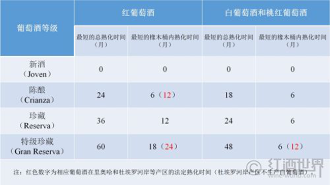 除了跟隨法國(guó)和歐盟的腳步之外,西班牙葡萄酒的分級(jí)也有著自己的特色,那就是對(duì)于DO及以上級(jí)別葡萄酒最短的總熟化時(shí)間和在橡木桶內(nèi)熟化時(shí)間的要求。西班牙根據(jù)熟化時(shí)間將葡萄酒分為4個(gè)等級(jí):新酒(Joven)、陳釀(Crianza)、珍藏(Reserva)和特級(jí)珍藏(Gran Reserva),這幾個(gè)術(shù)語也是我們常在西班牙紅酒的酒標(biāo)上見到的。各級(jí)別對(duì)于熟化時(shí)間的要求見下表: