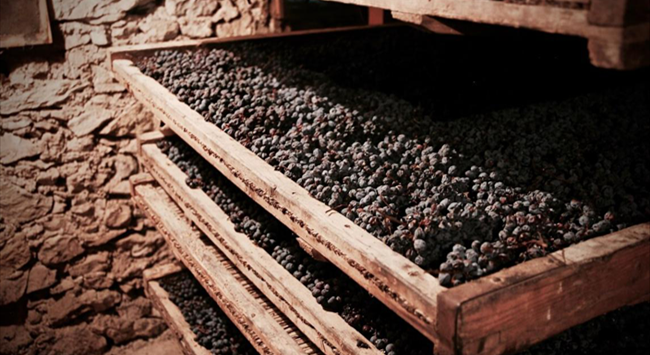 阿瑪羅尼葡萄酒獨樹一幟的風格,離不開其令人津津樂道的釀造方法——帕賽托法(Passito Method)。帕賽托法指的是用風干的葡萄釀造葡萄酒的工藝,因而又稱枯藤法(Appassimento)。每年葡萄成熟季時,酒莊的工作人員會提前采收葡萄,這時葡萄的酸度還很高,采收后并不急著將它們送去釀酒,而是將葡萄放在通風良好的室內(nèi)風干幾個月,使果實流失部分水分,糖分和風味物質(zhì)得以集中。這種方法可以為成酒增添風味、酒體和酒精度。