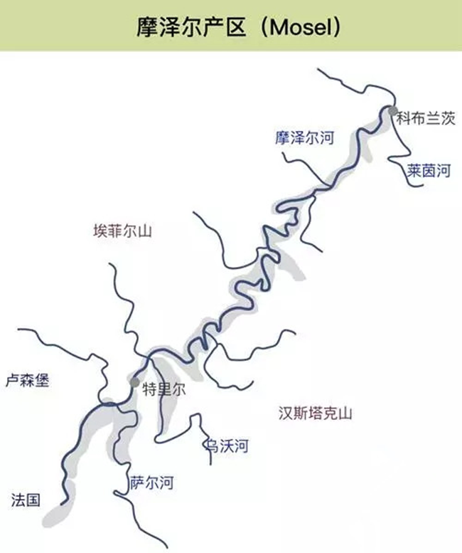 摩澤爾產(chǎn)區(qū)的名字以前是摩澤爾-薩爾-烏沃(Mosel-Saar-Ruwer),但為方便消費者記憶,后改稱為摩澤爾。摩澤爾氣候涼爽,葡萄品種以雷司令為主,出產(chǎn)全世界最精美也是最為昂貴雷司令葡萄酒的伊貢米勒酒莊就坐落著這里。此外,露森酒莊(Dr. Loosen)、普朗酒莊(Weingut Joh.Jos.Prum)和瑪斯莫麗酒莊(Markus Molitor)也是摩澤爾地區(qū)的優(yōu)秀名莊。