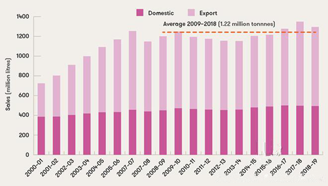 澳大利亞2018-19年度的葡萄酒產(chǎn)量略低于12億升,與十年平均水平持平,而比2017-18年度的產(chǎn)量低6%。盡管銷量下降,葡萄酒制造商的銷售額卻增加了1.14億美元,增幅2%,達(dá)到63.6億美元。