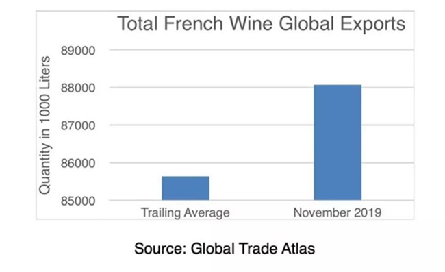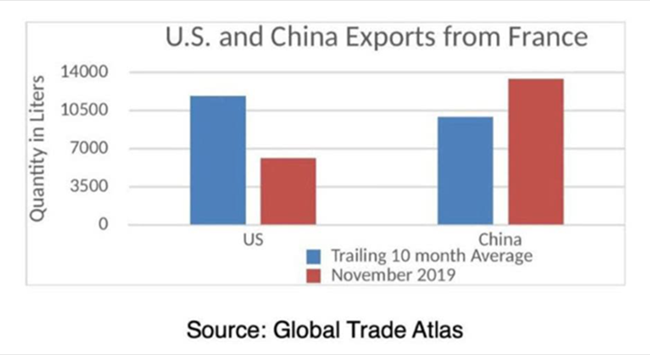 目前的關稅在迫使歐盟執(zhí)行DSB(即WTO爭端解決實體)建議方面是無效的。在實施關稅的頭一個月,法國葡萄酒貿易的全球出口卻大幅增長,恰好說明了這一點。法國葡萄酒的世界買家中,就有中國的身影。