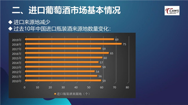 此外,進(jìn)口來源地減少,2019年瓶裝酒進(jìn)口來源地前十位約占進(jìn)口總額的96.0%。其中,又以澳大利亞葡萄酒的表現(xiàn)最為突出,在2019年以8個(gè)點(diǎn)的差距反超了法國葡萄酒,但在接下來的市場競爭中,澳大利亞葡萄酒也面臨一定挑戰(zhàn):首先,零關(guān)稅、大品牌驅(qū)動、投資移民等因素的推動作用會在階段性變化中逐漸減弱,澳洲與法國在接下來的市場中差距不會進(jìn)一步拉大;其次,意大利、智利等國葡萄酒在中國市場競爭愈加激烈化,近兩三年來,他們明顯加強(qiáng)了在中國市場的投入,處在一個(gè)比較穩(wěn)定的上升階段,我個(gè)人比較看好他們接下來的表現(xiàn)。