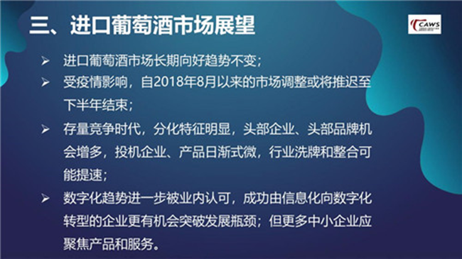 調(diào)整期被延長,進(jìn)口葡萄酒市場格局競爭更為激烈。 需要注意的是,自2018年8月開始,中國葡萄酒市場進(jìn)入到調(diào)整期。由于受到2020年疫情的影響,整個(gè)調(diào)整期結(jié)束時(shí)間將被延長,至于何時(shí)能結(jié)束,與當(dāng)下疫情防控工作的進(jìn)展緊密相關(guān)。如果防控進(jìn)展較為理想,我認(rèn)為在今年下半年開始,市場將逐漸恢復(fù)。