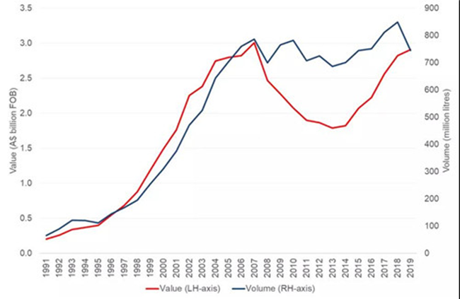 其中,高價值葡萄酒(價格高于10澳元/升)的出口額達(dá)到了創(chuàng)紀(jì)錄的11億澳元。