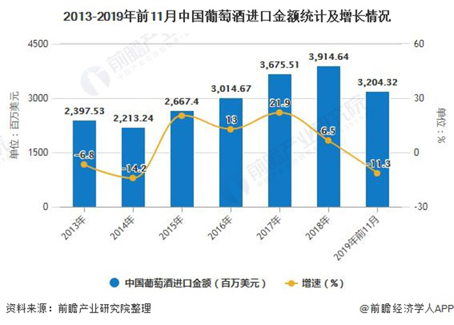 據(jù)中國海關(guān)總署數(shù)據(jù)顯示,2019年11月中國葡萄酒進(jìn)口量為53218千升,同比下降-4.7%。累計方面,2019年1-11月中國葡萄酒進(jìn)口量達(dá)到599355千升,同比下降10.6%。