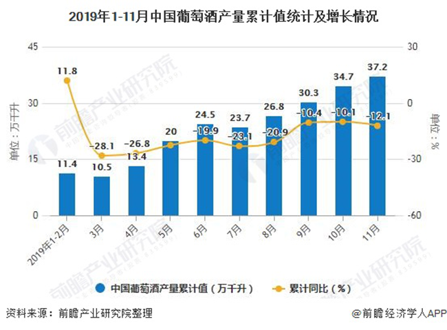根據(jù)國家統(tǒng)計局?jǐn)?shù)據(jù)顯示,2018年全年中國葡萄酒產(chǎn)量達(dá)到了62.9萬千升,累計下降7.4%。截止至2019年11月中國葡萄酒產(chǎn)量為4.9萬千升,同比下降5.8%。累計方面,2019年1-11月中國葡萄酒產(chǎn)量達(dá)到37.2萬千升,累計下降12.1%。