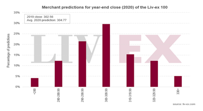 今年,Liv-ex會(huì)員預(yù)測(cè)優(yōu)質(zhì)葡萄酒市場(chǎng)將在2020年持平。平均而言,受訪(fǎng)者預(yù)測(cè)此行業(yè)基準(zhǔn)指數(shù)將上升0.7%,收于304.77點(diǎn)。 預(yù)測(cè)的中位數(shù)則稍低,為303.00點(diǎn),上升0.1%。