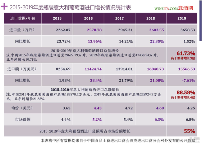 為了方便業(yè)內(nèi)人士更好的理解意大利酒近五年來的成長,意酒網(wǎng)將2015-2019年中國進(jìn)口瓶裝葡萄酒統(tǒng)計(jì)數(shù)據(jù)重新整理,將五年來意大利葡萄酒的進(jìn)口量、進(jìn)口額、均價(jià)和市場份額進(jìn)行對比,得出上圖的2015-2019年度瓶裝意大利葡萄酒進(jìn)口增長統(tǒng)計(jì)表。