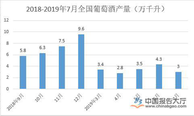 葡萄酒行業(yè)分析表示,根據(jù)國(guó)家統(tǒng)計(jì)局最新數(shù)據(jù)顯示,2018年全年全國(guó)葡萄酒產(chǎn)量達(dá)到了62.9萬(wàn)千升,累計(jì)下降7.4%。截止至2019年6月全國(guó)葡萄酒產(chǎn)量為4.3萬(wàn)千升,同比下降6.5%。累計(jì)方面,2019年1-6月全國(guó)葡萄酒產(chǎn)量達(dá)到24.5萬(wàn)千升,累計(jì)下降19.9%。