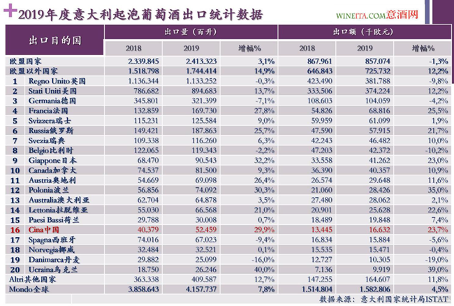 近日,意大利農(nóng)業(yè)和食品市場(chǎng)研究中心(ISMEA)發(fā)布《2019年度意大利起泡酒出口報(bào)告》。根據(jù)意大利國(guó)家統(tǒng)計(jì)局(ISTAT)的統(tǒng)計(jì)數(shù)據(jù),2019年意大利起泡酒出口量超過415萬百升,同比2018年增長(zhǎng)7.8%。出口額為15.828億歐元,同比2018年增長(zhǎng)4.5%。意大利起泡酒出口額的增長(zhǎng)速度高于同時(shí)期意大利葡萄酒的整體出口額增速(3.2%),是意大利葡萄酒出口增長(zhǎng)的有力引擎。