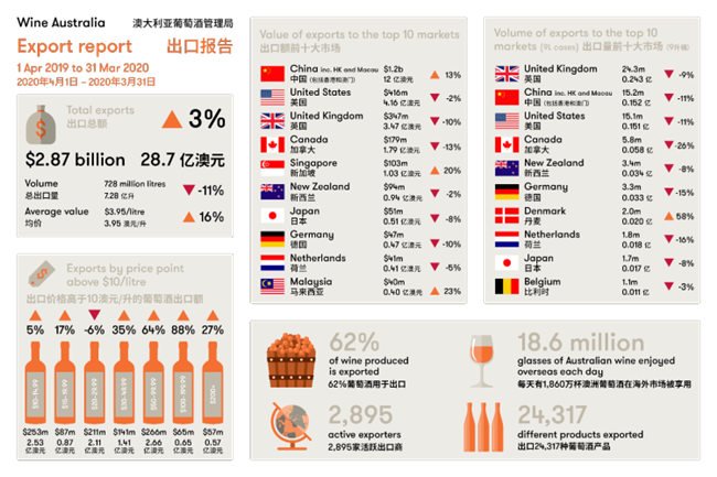 截至 2020 年 3 月底的 12 個月中,澳大利亞葡萄酒的出口總額持續(xù)增長。不過,澳大利亞葡萄酒管理局也報告稱新型冠狀病毒對澳大利亞葡萄酒出口的影響還未全面顯現(xiàn)。