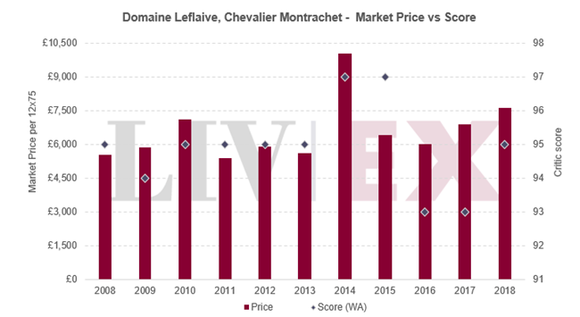 最后,下圖比較了勒弗萊的Chevalier Montrachet(該品牌交易最活躍的葡萄酒)最近十個(gè)年份的市場(chǎng)價(jià)格。 它最新的2018年份自去年12月在英國(guó)發(fā)布以來,市場(chǎng)價(jià)格已漲了19%。