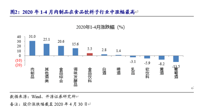 尤其是進入2020年4月份以來,食品飲料板塊上漲9.4%,其中重要原因是:國內(nèi)疫情控制得當,消費回暖,以白酒為代表的可選消費重新獲得市場青睞,漲幅領跑各大品類,為13.8%,而葡萄酒銷售亦有上漲趨勢,為5.5%。