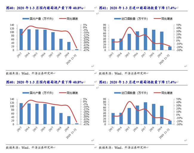 觀察行業(yè)數(shù)據(jù),2020年1-3月國內(nèi)葡萄酒產(chǎn)量同比降40.8%,降幅較年初擴大;進口酒量同比下滑17.4%,同樣加速下滑。