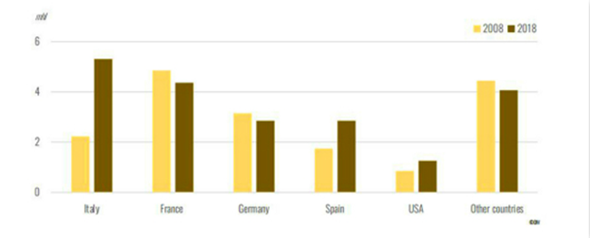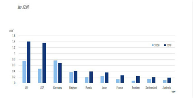 按價(jià)值計(jì)算,美國是最大的進(jìn)口國(11.12億歐元),其次是英國(7.23億歐元),日本(5.23億歐元),德國(4.25億歐元),新加坡(3.08億歐元)。自2008年,美國、日本市場有了顯著增長,年平均增長率分別為9%和7%。