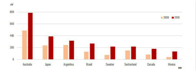 這六大全球起泡酒消費(fèi)國所占份額由2008年的76%下降到了2018年的70%。與此同時(shí),全球涌現(xiàn)出了一些新興起泡酒消費(fèi)國。按平均年度增長率排名依次為:墨西哥(13%)、瑞典(11%)、加拿大(8%)、巴西(8%)、日本(5%)、澳大利亞(5%)、瑞士(4%)、阿根廷(3%)。