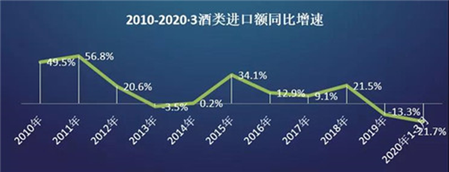 2020年一季度,中國進(jìn)口酒類金額8.7億美元,同比下降21.7%。2010—2019年,十年間的年均復(fù)合增長率為13.8%。