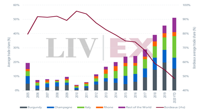 隨著市場繼續(xù)擴大,波爾多的交易份額已跌至歷史新低的41%;勃艮第也跌至9.3%。 這進一步證實,買家的興趣已擴展到這兩個高價值酒區(qū)之外。