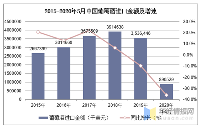 2015-2020年5月中國(guó)葡萄酒進(jìn)口金額及增速