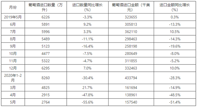 2015-2020年5月中國(guó)葡萄酒進(jìn)口數(shù)量及增速