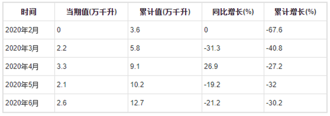 根據(jù)中國(guó)報(bào)告大廳對(duì)2020年1-6月全國(guó)葡萄酒產(chǎn)量進(jìn)行監(jiān)測(cè)統(tǒng)計(jì)顯示:2020年6月全國(guó)葡萄酒產(chǎn)量2.6萬千升,同比下降21.2%,2020年1-6月全國(guó)葡萄酒產(chǎn)量為12.7萬千升,累計(jì)下降30.2%。