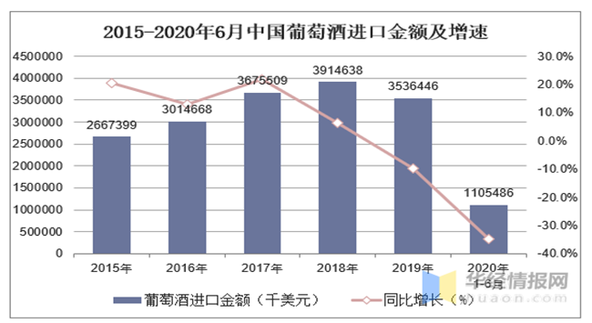 2015-2020年6月中國葡萄酒進(jìn)口金額及增速