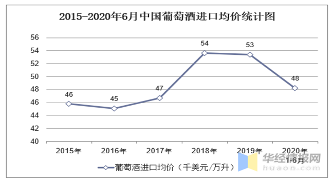 2015-2020年6月中國葡萄酒進(jìn)口均價統(tǒng)計圖