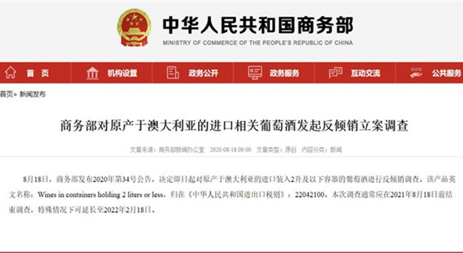 8月18日,商務(wù)部發(fā)布公告稱,決定即日起對原產(chǎn)于澳大利亞的進(jìn)口裝入2升及以下容器的葡萄酒進(jìn)行反傾銷調(diào)查。