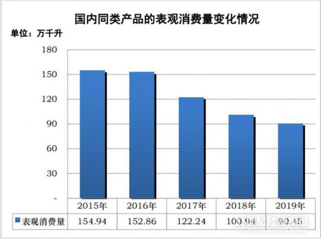 一方面,國內(nèi)產(chǎn)業(yè)同類產(chǎn)品的產(chǎn)量由2015年的116.11萬千升下降至2019年的45.15萬千升,大幅減少61.11%。