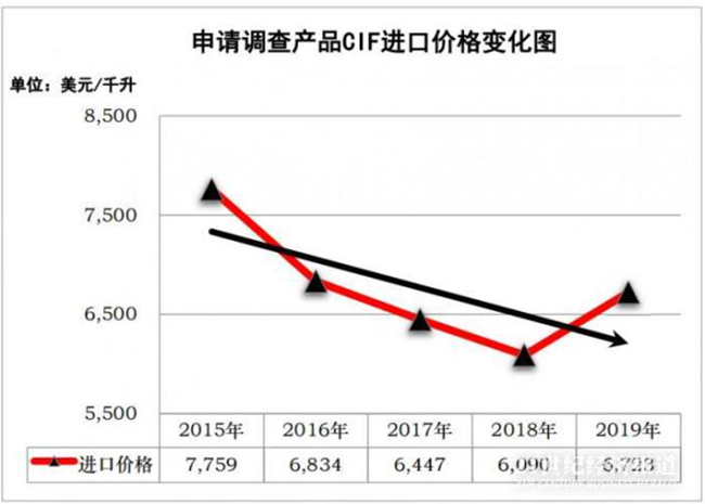 申請調(diào)查期內(nèi),澳大利亞該類葡萄酒的進(jìn)口價格總體呈下降趨勢。2015年至2019年,澳大利亞該類葡萄酒的進(jìn)口價格分別為7,759美元/千升、6,834美元/千升、6,447美元/千升、6,090美元/千升和6,723美元/千升,2016年比2015年下降11.92%,2017年比2016年下降5.67%,2018年比2017年下降5.54%,2018年比2015年大幅下降21.51%,2019年比2018年上漲10.39%,但仍比2015年累計下降13.36%。