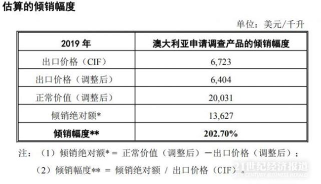 申請書認(rèn)為,在進(jìn)口數(shù)量持續(xù)大幅增長、市場份額持續(xù)上升、相對于國內(nèi)同類產(chǎn)品總產(chǎn)量的比例也在持續(xù)上升的情況下,澳大利亞該類葡萄酒的降價行為對國內(nèi)產(chǎn)業(yè)造成了巨大的沖擊,申請書預(yù)估,澳大利亞該類葡萄酒的傾銷幅度為202.70%。