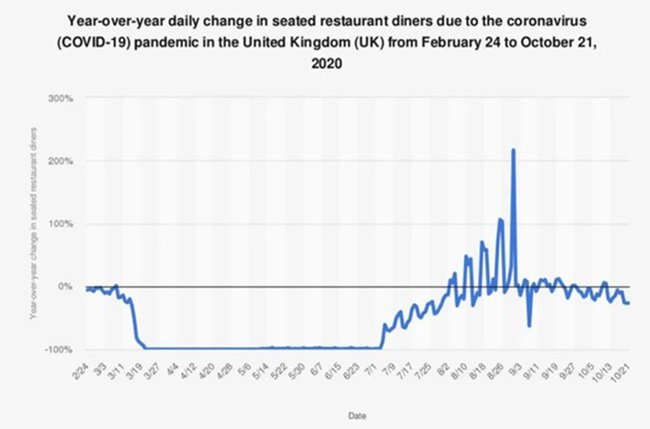 雖然8月期間英國政府推出“半價用餐“政策來拉動消費(fèi),但好景不長,第二波疫情再一次使酒吧和餐廳行業(yè)陷入危機(jī)。