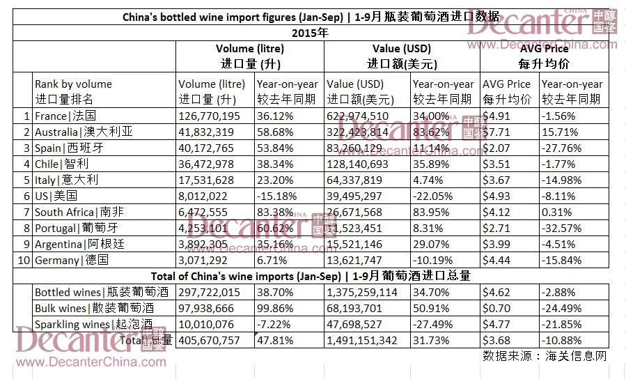 根據(jù)海關(guān)發(fā)布的數(shù)據(jù)顯示,今年一月到九月,中國(guó)市場(chǎng)瓶裝葡萄酒進(jìn)口量同比上升38.7%,達(dá)3.0億升,進(jìn)口額上升34.7%,達(dá)14億美元。其中,法國(guó)和澳大利亞葡萄酒進(jìn)口增長(zhǎng)顯著。這表示,中國(guó)進(jìn)口葡萄酒市場(chǎng)在2015年前三季度強(qiáng)勢(shì)回暖。