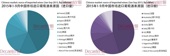 從前三季度的數(shù)據(jù)看,澳大利亞占據(jù)中國(guó)葡萄酒進(jìn)口總量的14%,金額則占23%。但法國(guó)依然是中國(guó)最主要的瓶裝進(jìn)口葡萄酒來源,占據(jù)43%的進(jìn)口量和45%的進(jìn)口額(見下圖)。