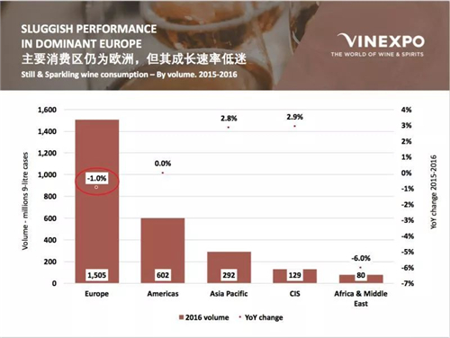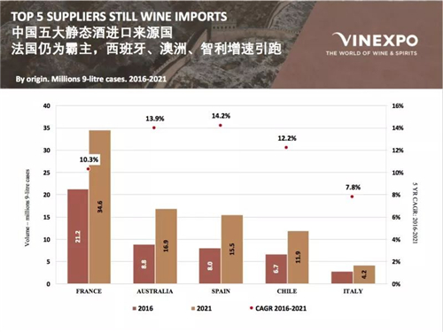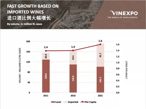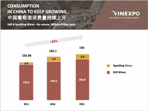 Vinexpo和IWSR對當前至2021年全球葡萄酒市場的預測報告稱,2021年中國葡萄酒消費量將趕超英國,增長39.97%,屆時中國的人均消費量將達到1.6升。