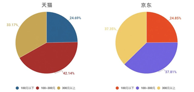 在天貓和京東兩大電商平臺上,智利葡萄酒的酒款數(shù)量占比均為8.4%,非常一致;此外,兩大平臺不同價位的智利葡萄酒分布也相對接近──低端智利酒的占比略低,而中高端的酒款數(shù)量比起意大利等競爭對手來說則明顯占比更高。