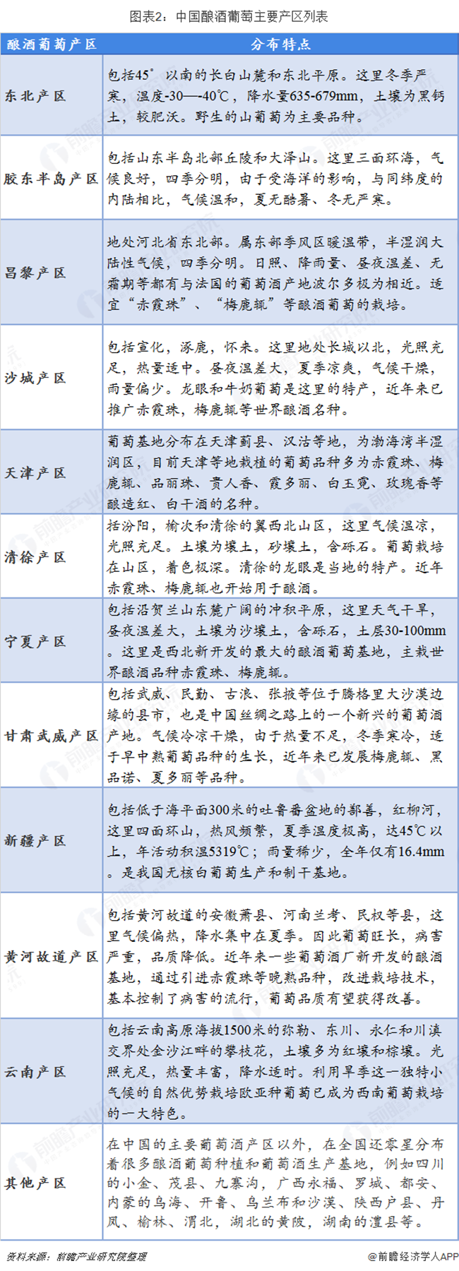 目前國(guó)內(nèi)主要的釀酒葡萄產(chǎn)區(qū)分布在華北地區(qū)、沿海一帶、新疆、甘肅等地,大面積的種植滿足了中國(guó)的葡萄酒產(chǎn)業(yè)基本的原料需求。釀酒葡萄一般分為白葡萄和紅葡萄兩種,這兩種葡萄更適合沿海地區(qū)的種植。釀酒葡萄一般在九月份成熟,因?yàn)閷?duì)水分要求較大,所以不適合西部地區(qū)東北地區(qū)種植,可以做鮮食,但不適合存儲(chǔ)。在中國(guó)北緯45°-25°廣闊的地域里,分布著各具特色的葡萄、葡萄酒產(chǎn)地。葡萄酒行業(yè)經(jīng)過多年的發(fā)展,逐步形成11個(gè)具有典型產(chǎn)地特征葡萄酒產(chǎn)區(qū)。