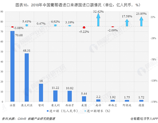 根據(jù)中國(guó)葡萄酒及烈酒進(jìn)出口協(xié)會(huì)(CAWS)發(fā)布的2018年中國(guó)進(jìn)口葡萄酒數(shù)據(jù)報(bào)告,2018年法國(guó)、澳大利亞和智利為我國(guó)葡萄酒三大進(jìn)口來源國(guó)。其中法國(guó)葡萄酒進(jìn)口量達(dá)1.74億升,同比下降21.06%;進(jìn)口金額70.68億人民幣,同比下降3.08%。盡管法國(guó)進(jìn)口量和進(jìn)口額均較上年有所下降,與第二名澳大利亞的差距逐漸縮小,但其在中國(guó)進(jìn)口葡萄酒市場(chǎng)上的地位依舊排名第一。